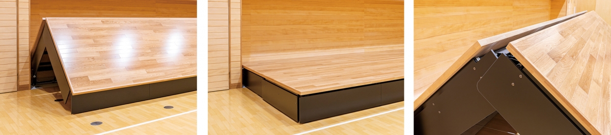 アイステージMWは、手動により設置・収納ができるステージです。スプリングの力を利用した跳ね上げ式構造により数名で容易に操作ができます。