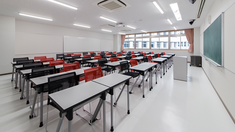 1階 D102講義室/イス:ティーポ、デスク:SCM-700、教卓:S-3型特注品(横移動キャスター付)