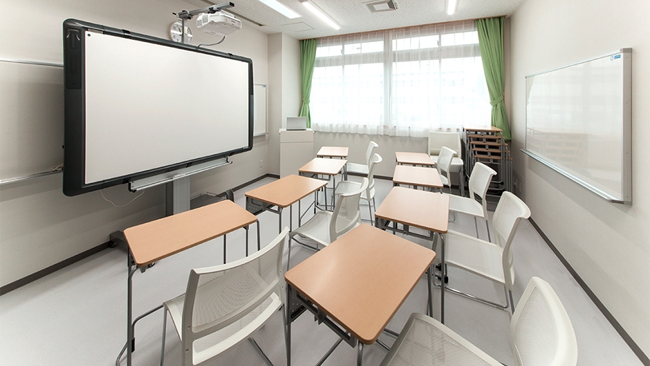 1階 D105第1演習室/イス:ルッシュ、テーブル:DT-15、教卓:S-3型特注品(横移動キャスター付)