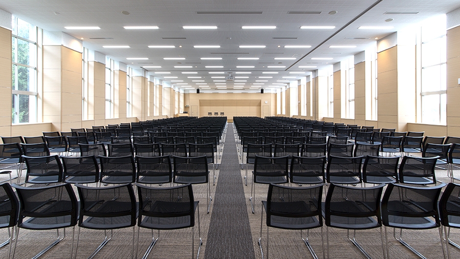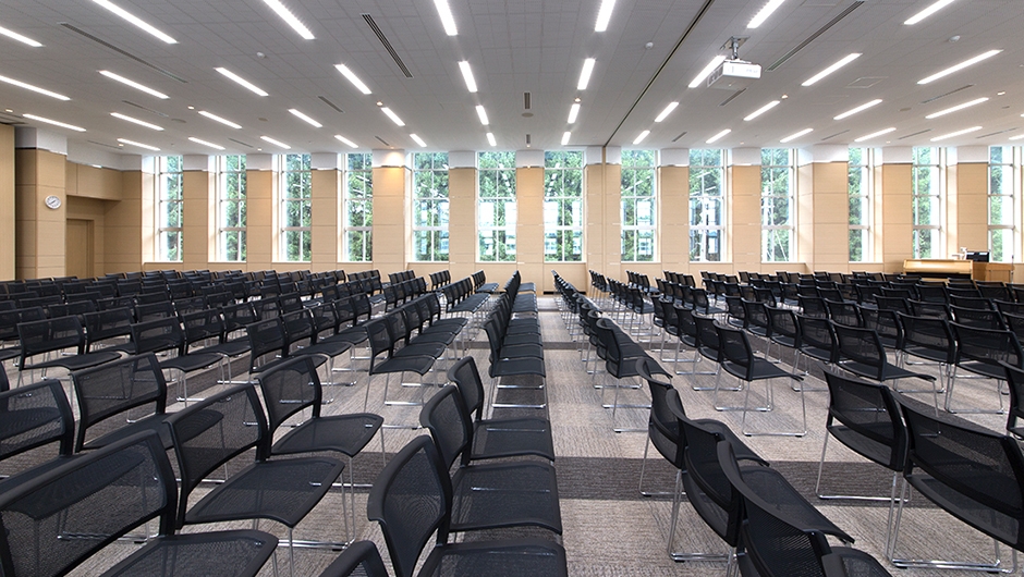 平成28年9月に竣工した新校舎は、約400人収容の「アクティブホール」を初め、講義室、演習室、保健室、相談室など、勉学と学生生活を快適にするための施設が設置されています。既存校舎連絡通路とエントランスとの間にあり、多くの学生が行き来する学生ラウンジは、2層吹き抜けの大きなガラス面を持つ開放的な大空間となっており、学生のくつろぎと交流の場として期待されています。尚、当校舎と学生ラウンジの愛称「スチューデントホール」「岩姫ラウンジ」は、学内と卒業生からの応募で選ばれました。