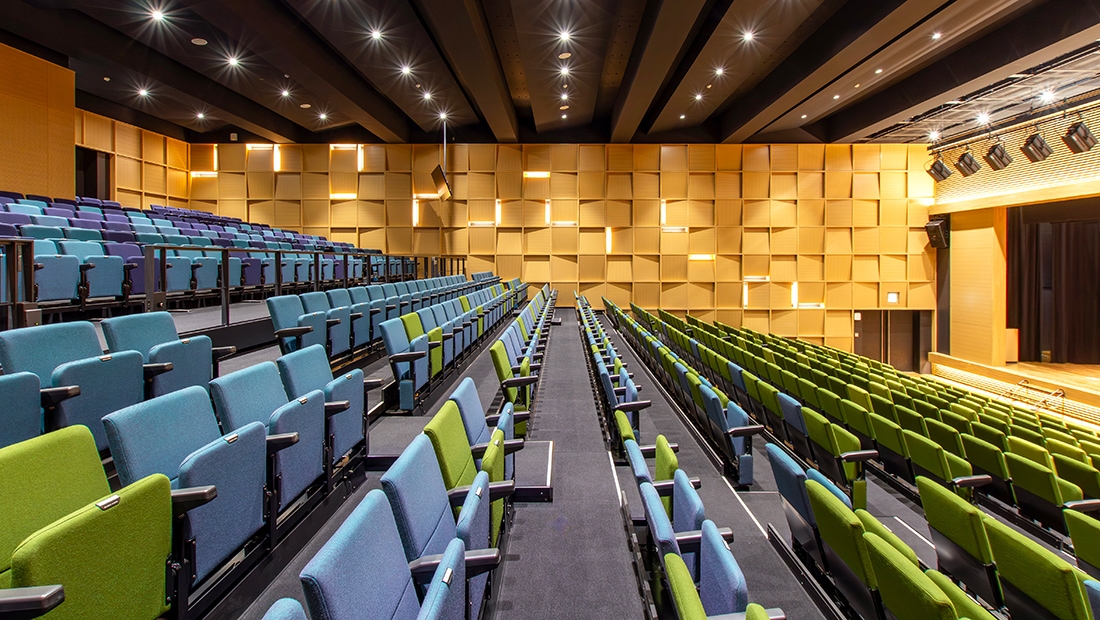 講堂/移動観覧席「テレスコープスタンド」:AHP-A8214-20P 390席、固定席:ATS-2014 210席 総席数 600席、イス:ジーン