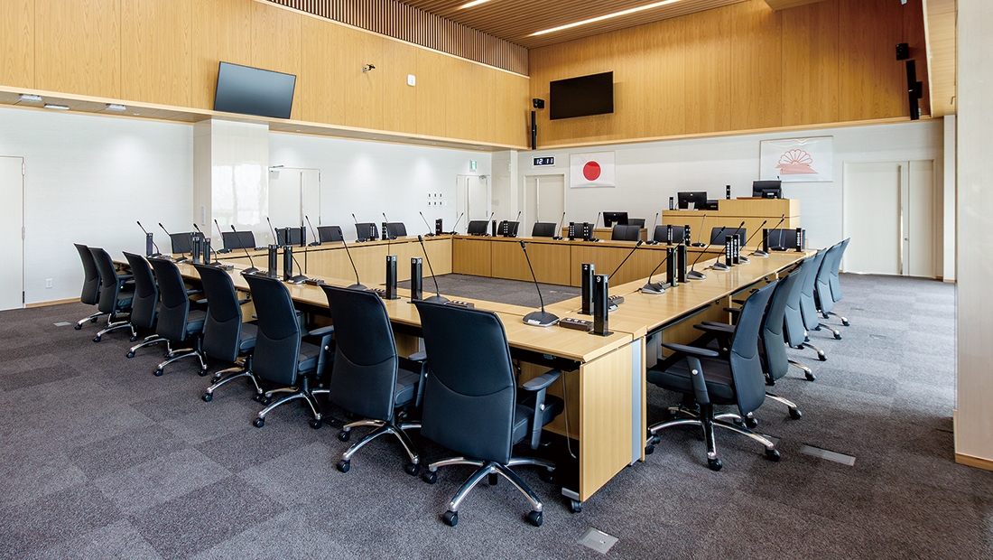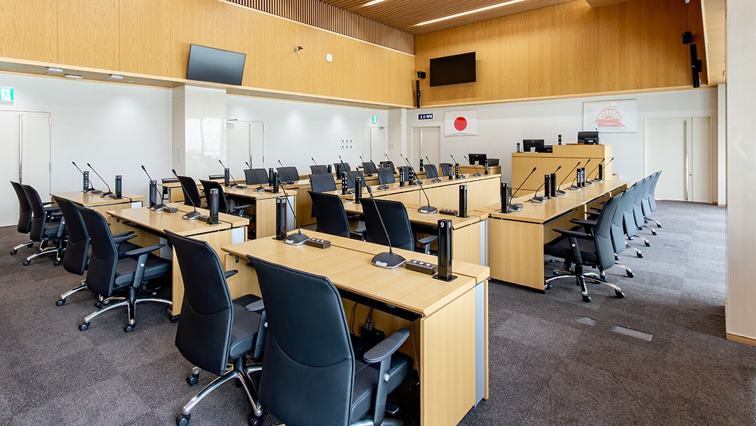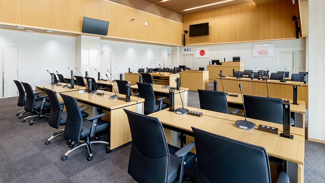 議場/議場椅子:AEX、議場机:GMT特注品、その他議場家具一式、傍聴席:ミンゴα、柵