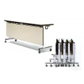 天板の回転に連動してキャスターが上下する「シンクロトップ機構」を世界で初めて開発。使用時はキャスターが上昇しテーブルはしっかり固定され、天板をたたむとキャスターが接地して可動できる画期的な機構。抜群の安定感と機動性により、使い勝手が追求されています。