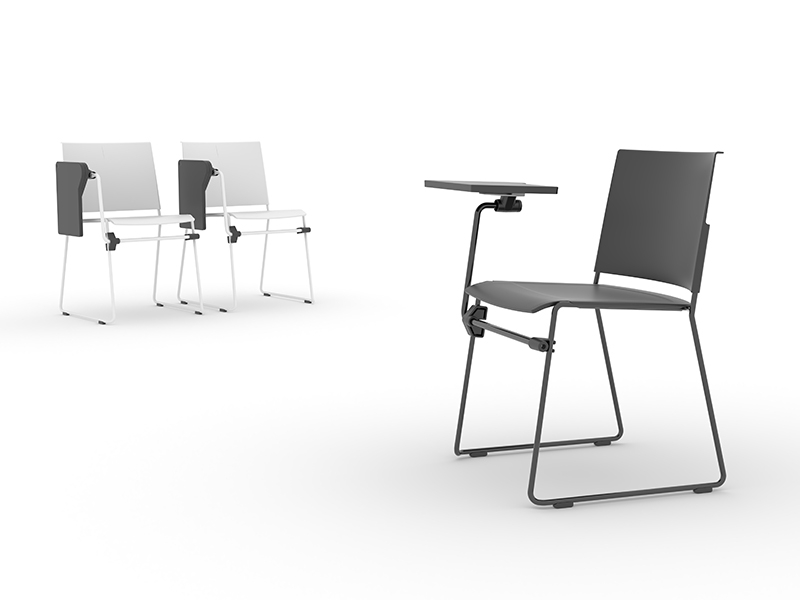 集会・ミーティングスペースで使用されるシンプルで美しいスタッキングチェア。薄さと優れた座り心地を実現したエラストマーシートと、ハーフパイプにプレス成型されたシートフレームの一体的デザインは革新的です。今回新たに着脱が可能なタブレットを追加しました。シーン合わせた使い方を選択でき、タブレットの専用収納台車も揃えています。