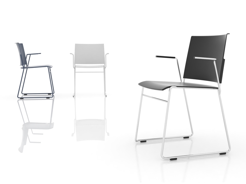 集会・ミーティングスペースで使用されるシンプルで美しいスタッキングチェア。薄さと優れた座り心地のクッション性を実現したエラストマーシートと、ハーフパイプにプレス成型されたシートフレームの一体的デザインに調和する肘付アイテムを新たに追加した。ストレートタイプ同様、専用台車に50脚積載することができる超スタック構造である。