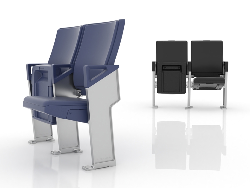 スタジアムやホール用の床固定観覧席です。基本の高密度PEブローシートとアルミフレームの堅牢な従来構成を踏襲しつつも、今までにないスクエアでソリッドなスタイリングを追求することで、現代の、海外集客も見込んだグローバルな施設イメージが求められている大規模体験空間にふさわしいスタイリッシュなイメージを追求しました。