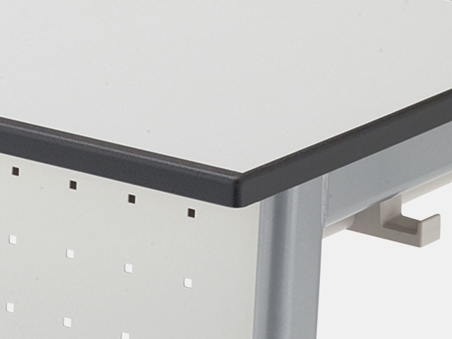 AITOP天板のエッジに使用されているポリウレタン樹脂は、高い耐衝撃性と耐摩耗性を持っています。 また、樹脂エッジが天板本体と一体化しているため密着性が高く、耐水性・耐湿性にも優れています。