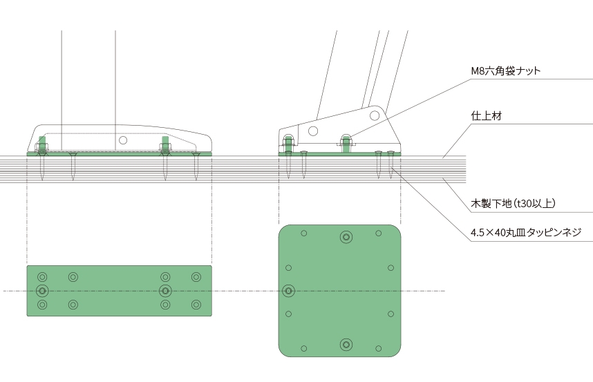 木製床はコンクリート床と比較して、アンカーボルトの保持力(引抜き強度)が低いため、脚ベースの取り付け前に、木製床固定プレート(図中緑色部分)を先行して取り付けます。木製床固定プレートをM4.5タッピンネジにしっかり固定することにより、木製床に対して充分な保持力を発揮します。