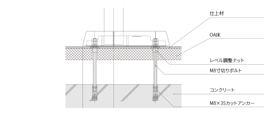 OAフロアにはさまざまな種類があるため、その都度お問い合わせ願います。OAフロア支柱と、机・イスのアンカーボルトが干渉しない配置計画が必要です。基本的に机・イスのアンカーボルトは、フロアパネルを貫通し、コンクリートスラブに打込みます。レベル調整ナットを床と面一にすることで、ボルトの締込みを制限でき、フロアパネルには負担をかけません。