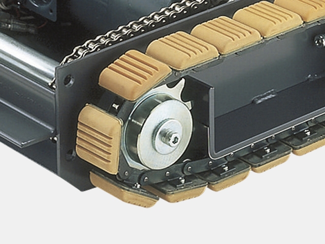 パワートラックのキャタピラーは表面にゴム質のパッドを採用しています。パッドは車輪のような「線」ではなく、「面」で床に接地するため、大きな摩擦力を得ることができます。また、パワートラック1台あたり常時8枚以上のパッドが床面に接地しており、床面の一部に集中して荷重が加わることはありません。