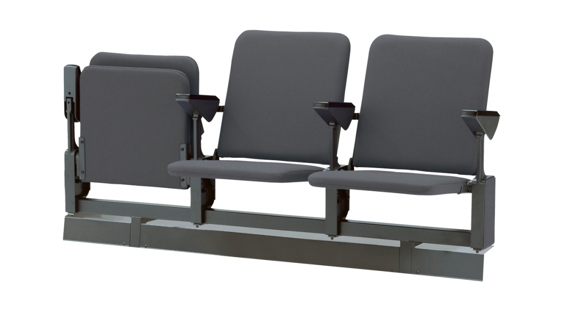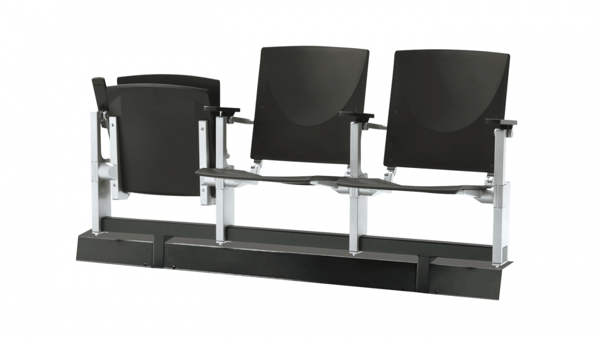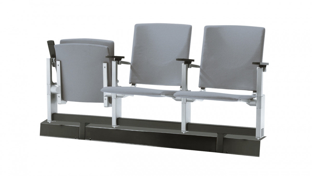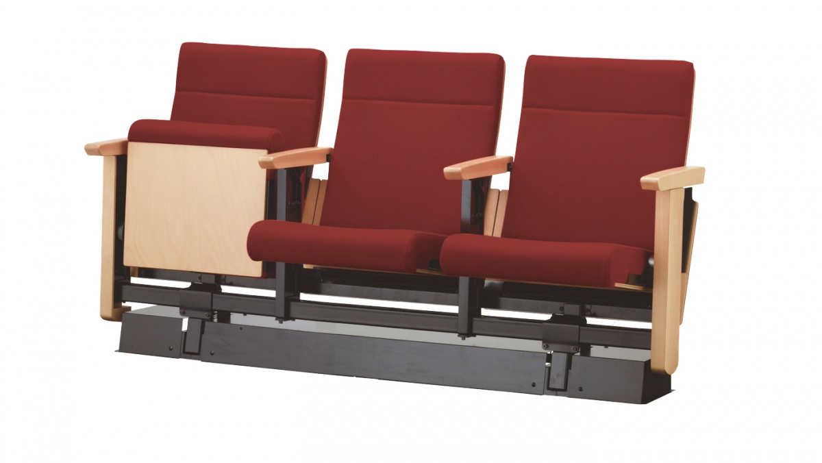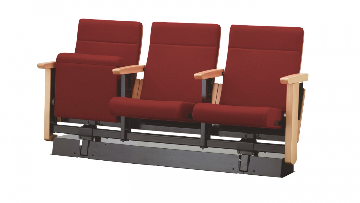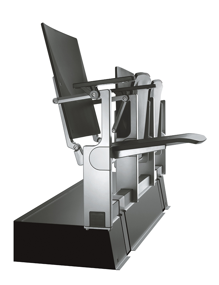 2〜4人単位で連結されているイスの背もたれを持って、上に引き起こすだけでセットできます。イス本体は装置内にあるばねのアシストにより軽い力で持ち上げられ、所定の位置まで起こすと自動でロックされます。