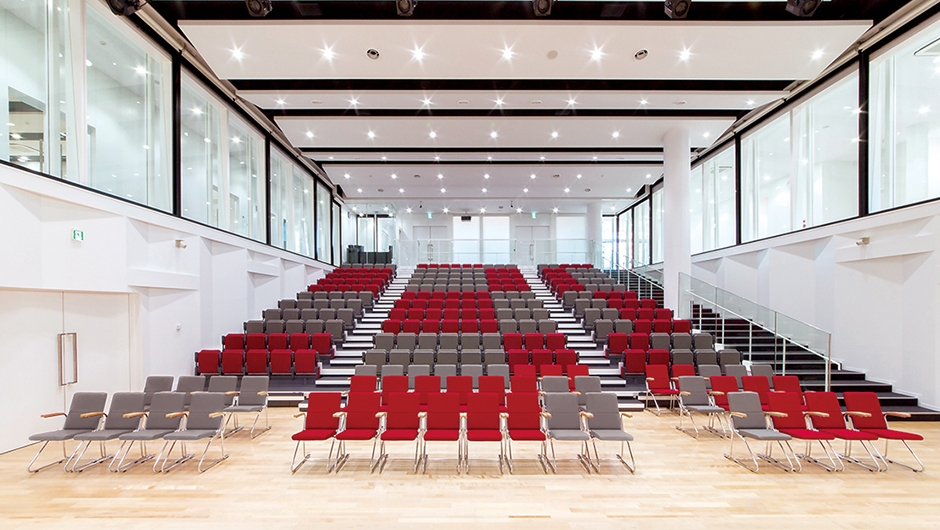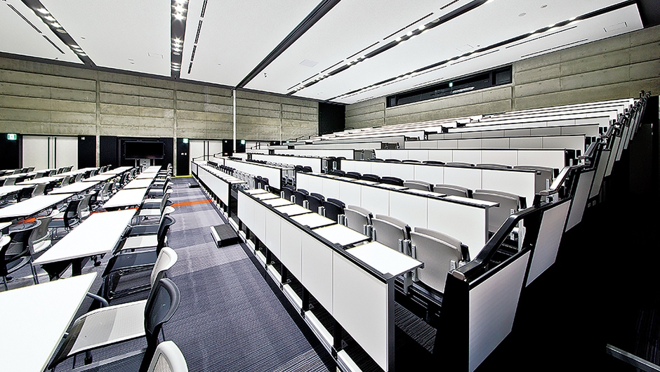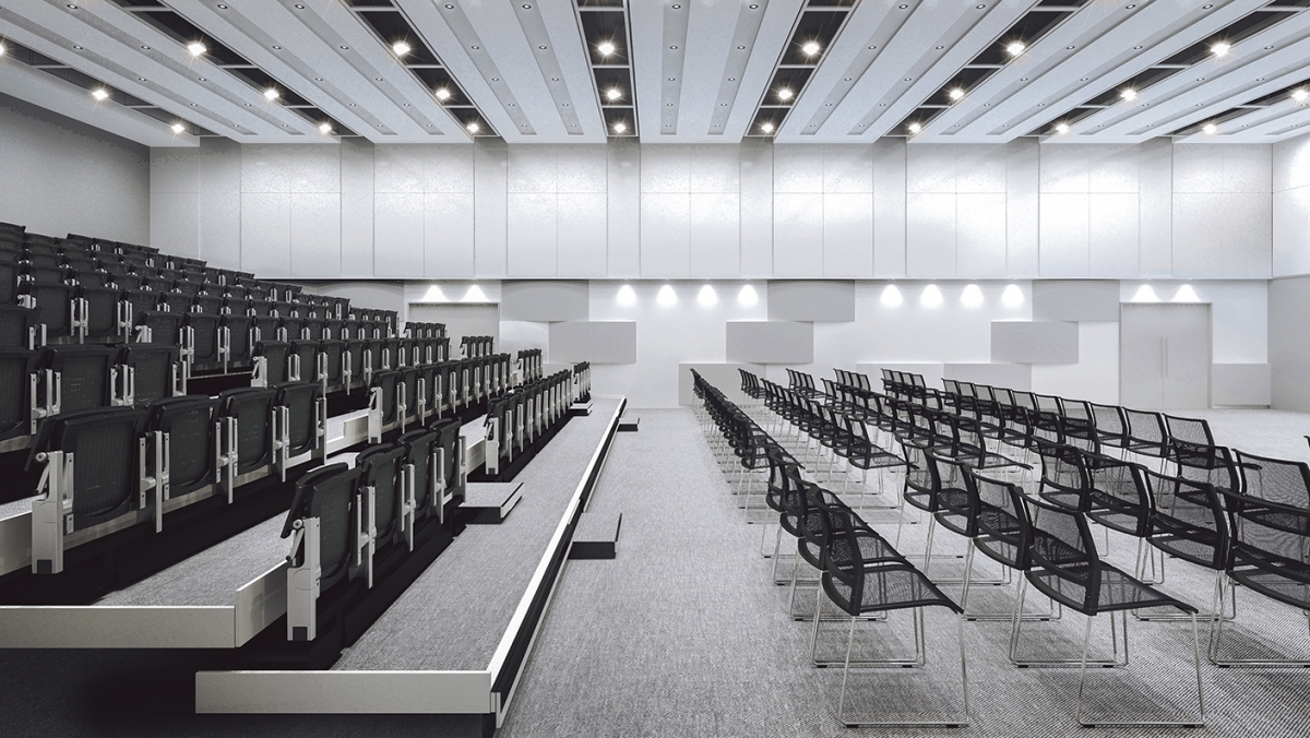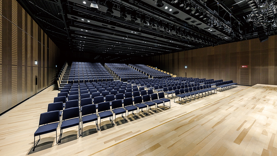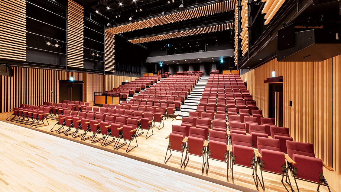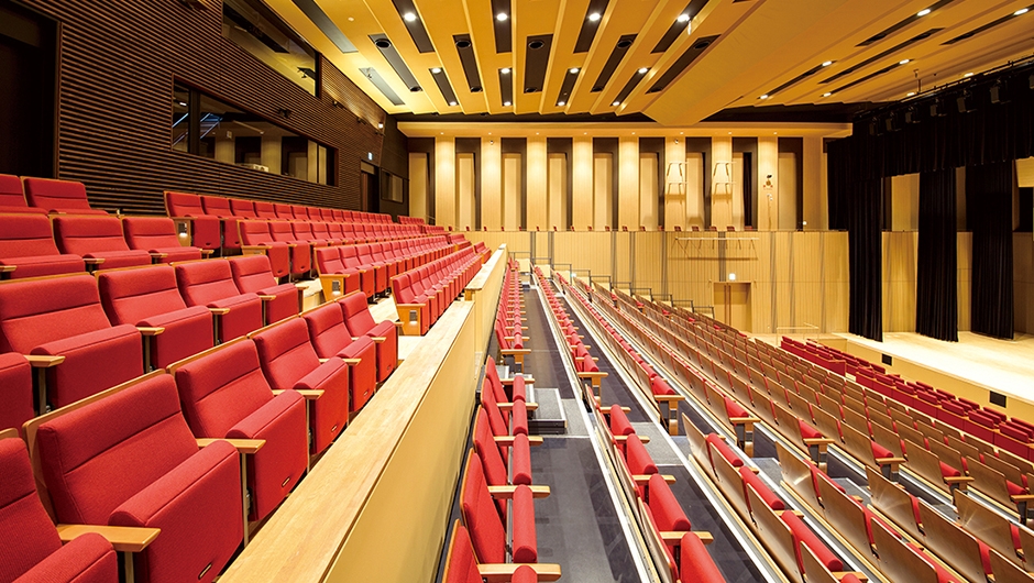 移動観覧席を初め、床固定席、スタッキングチェアのような可動席など、ホール内の客席全体の意匠を、同じイメージで統一できます。