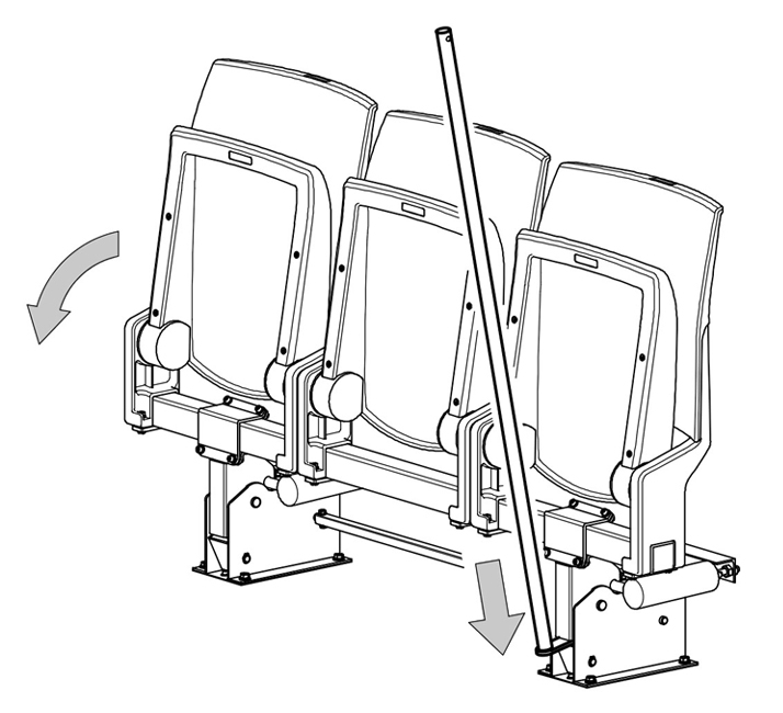 付属の「起倒ロック解除用レバー」を、起倒装置正面の隙間に差し込み、レバーを下に押せばロックを解除できます。レバーを押したままイスを傾けると、イスがばねとダンパーの作用でゆっくりと倒れます。客席 1 連ごとに起倒装置は 2 つありますが、お互いに連動しているので、どちらの起倒装置からでも操作できます。