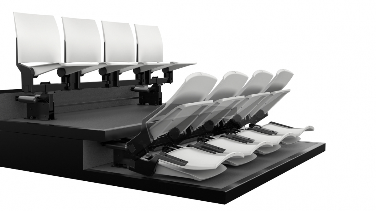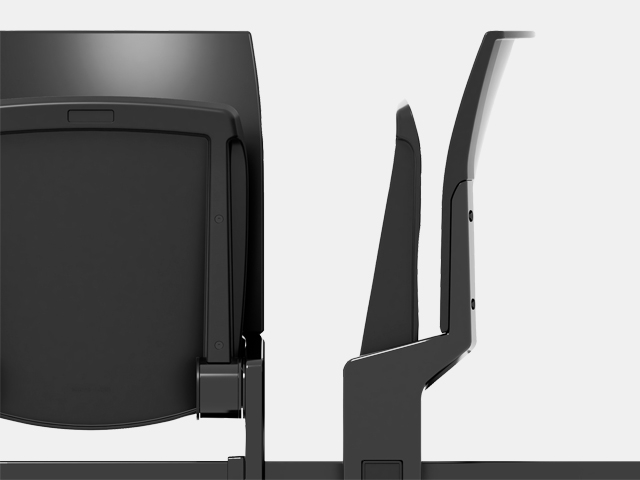 離席時には自動的に座が跳ね上がり、背もたれと肘掛も同時にコンパクトにたたまれます。快適な座り心地を実現するため、背と座は十分な大きさを確保しながら、離席時の収納性を限界まで高めることで、通路幅を最大限に確保しています。