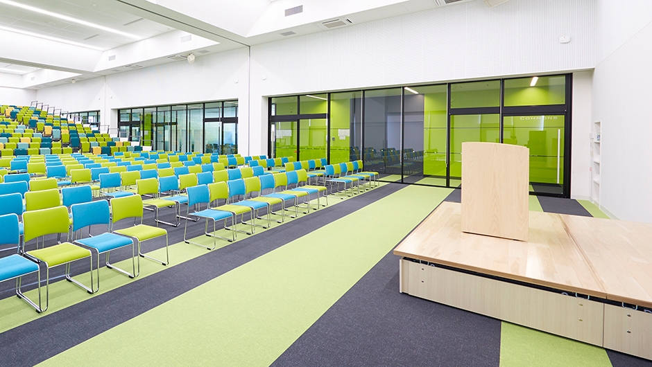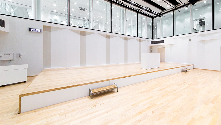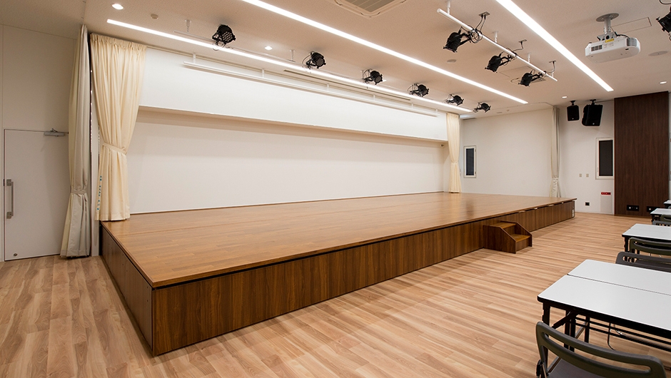 ステージ下は、ホールで使用するイスの収納スペースとしても活用可能です。出し入れに便利な専用台車を用意いたしております。
