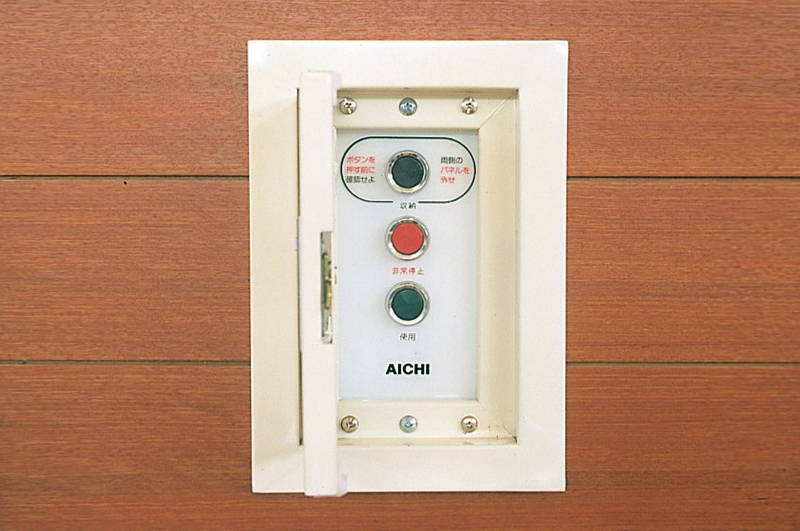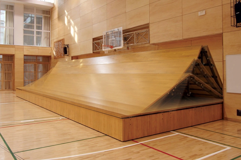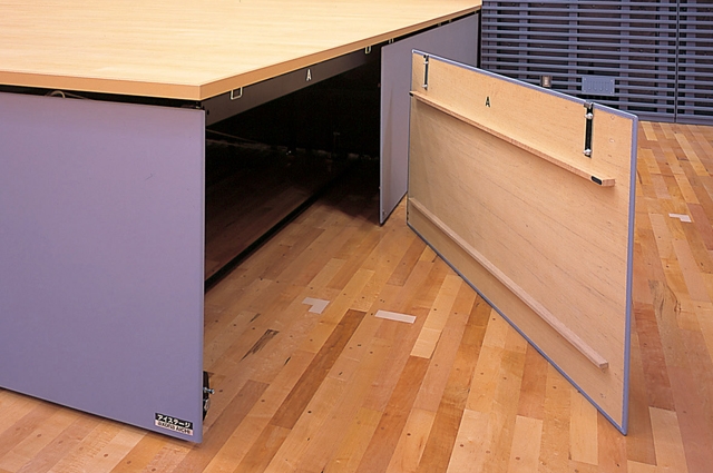アイステージMWは、手動により設置・収納ができるステージです。スプリングの力を利用した跳ね上げ式構造により数名で容易に操作ができます。
