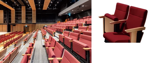 テレスコープスタンドを採用することにより、本格的なホール用椅子を段床客席として設営できます。従来のような折り畳み椅子などを並べた空間ではなく、文化的催事にも適した、より質の高い空間とすることが可能です。