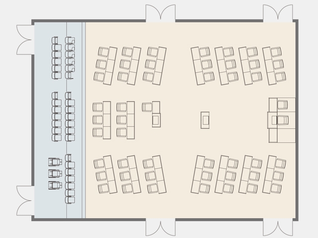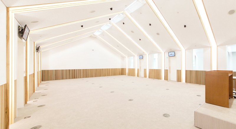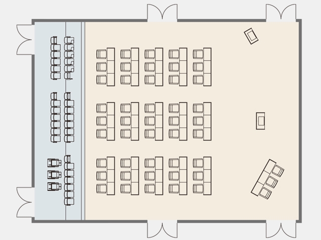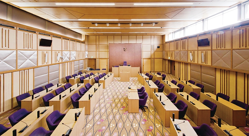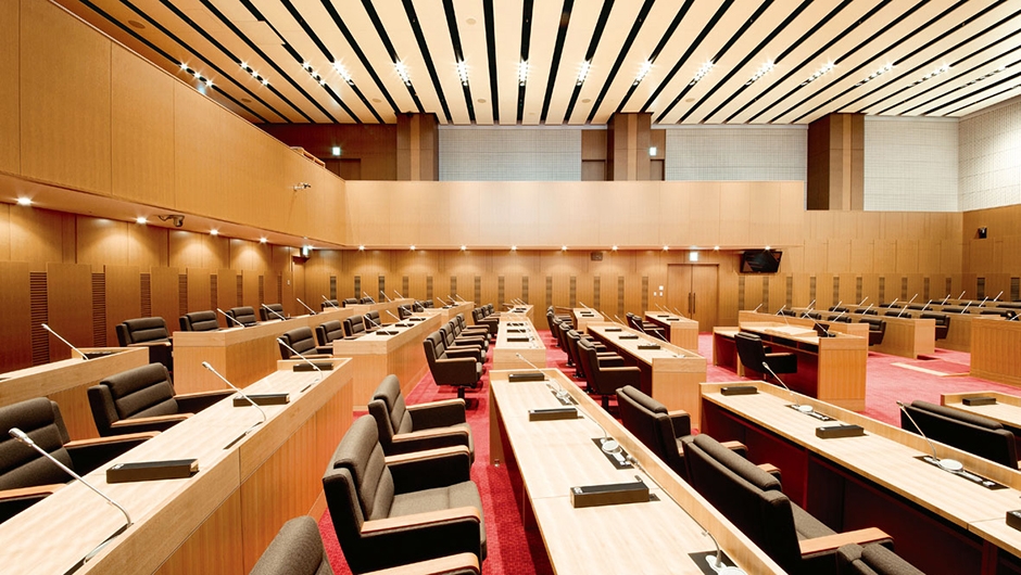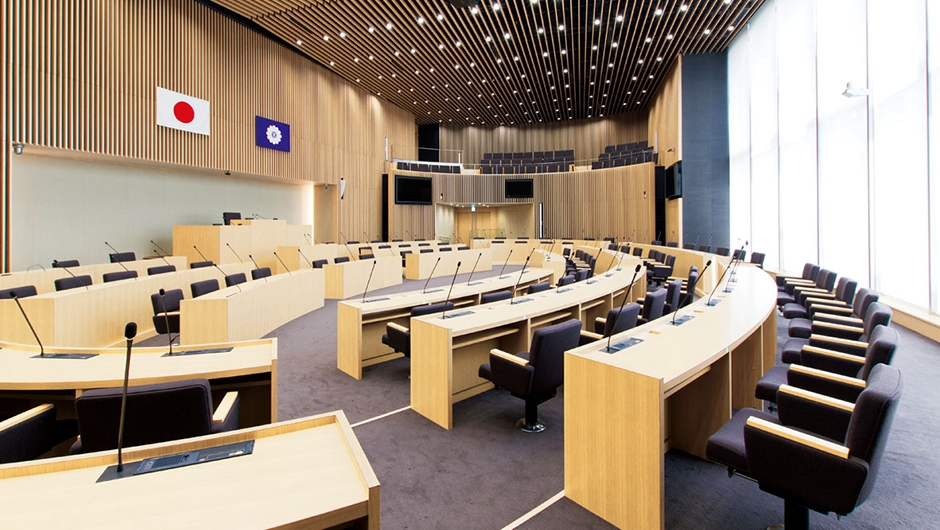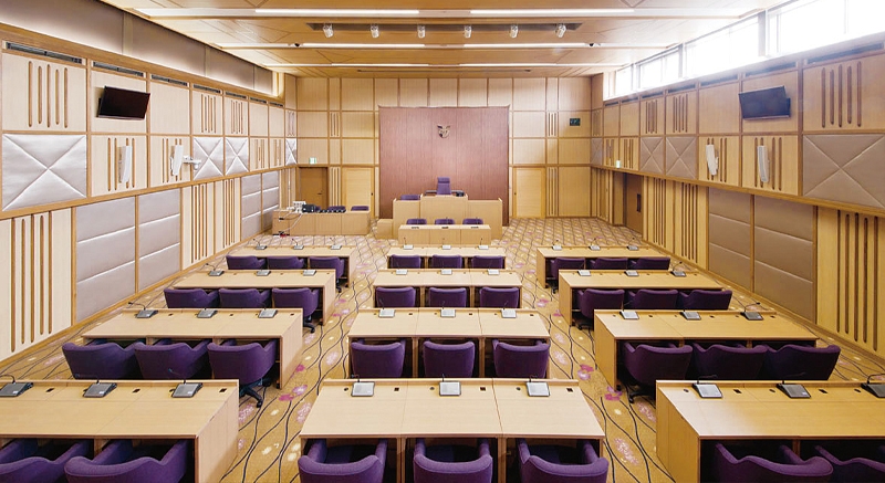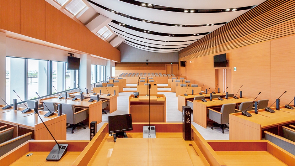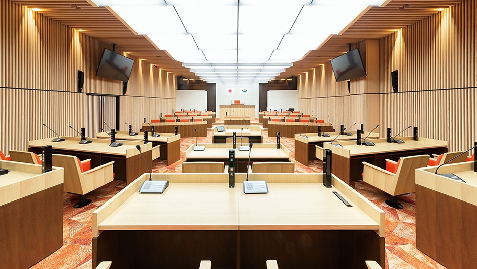 議員側と執行部側が対面する配置ですが、議場の多目的利用を図るために、段床のないフラットな床となっています。家具は机、椅子共にキャスターを装備した可動型となります。