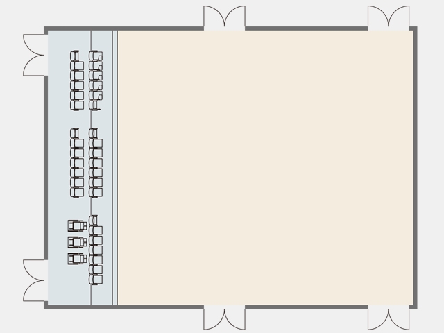 議場を議会以外の用途にも有効活用するため、机椅子を全て可動式とした例です。机(GMT)は天板を折り畳んで収納できるので、高い収納効率を得られます。机の側板(オプション)と名札は着脱式です。ステージも折り畳んで収納できます。