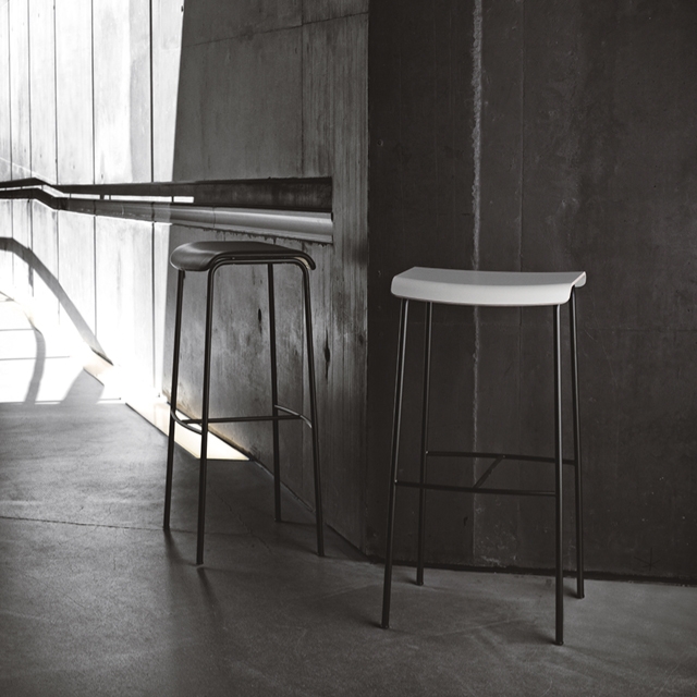 オフィス、レストラン、バー、カフェ、食堂などで使われているハイテーブルやハイカウンターに合わせた、座面のゆるやかなカーブが自然と身体にフィットするシンプルなデザインのバースツールです。2種類の高さからお選びいただけます。