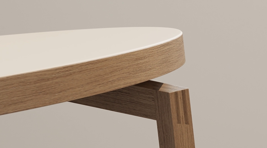 框を持たないシンプルな構造で、多様なサイズを持つMIXテーブルは、様々なシーンで理想的なレイアウトを可能にします。ハニカム構造をもつ厚さ37mmの天板は、軽量でありながら耐久性を兼ね備えています。2種類の木製脚よりお選びいただけます。