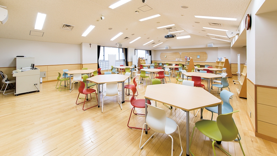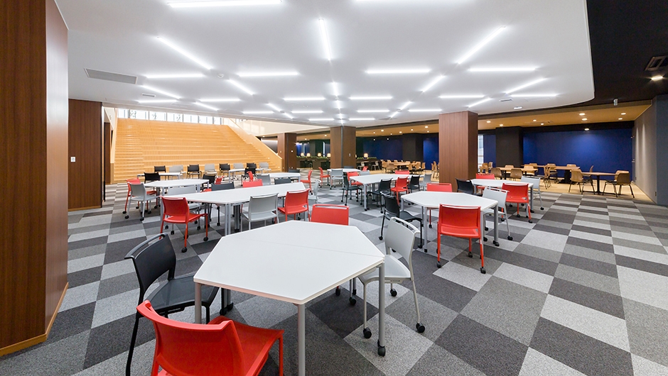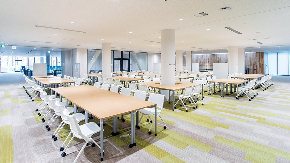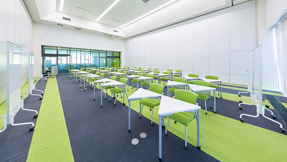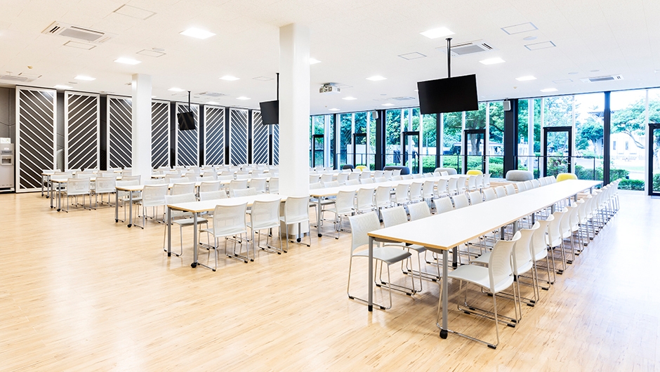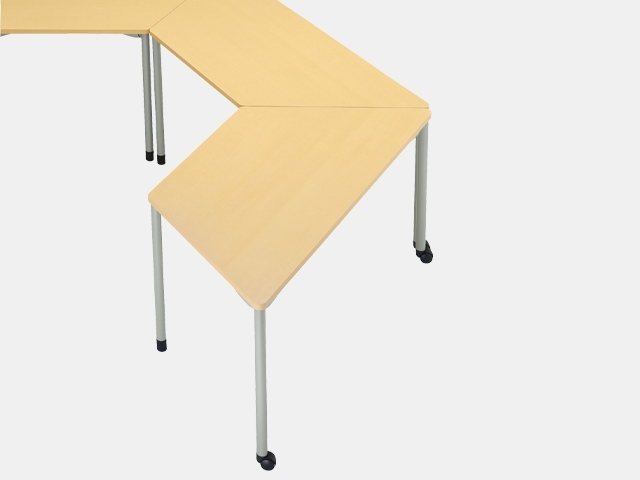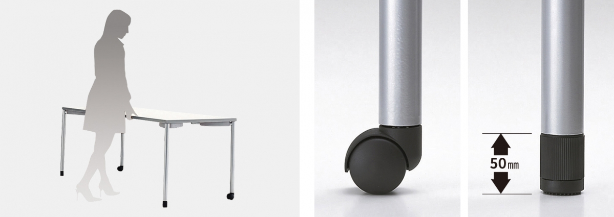 テーブルのレイアウト変更では、キャスターを接地させながらテーブルの片側を持ち上げることで楽に移動できます。また、キャスター側の脚を水平に引き出せば積み重ねられるので合理的な収納ができます。