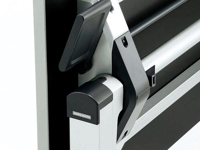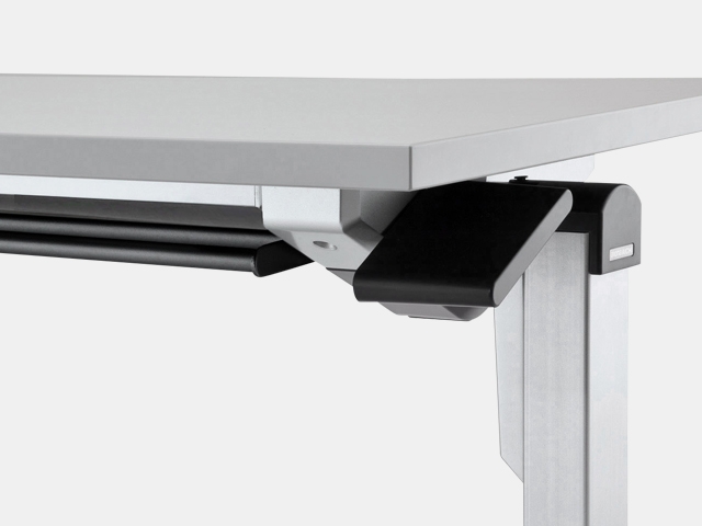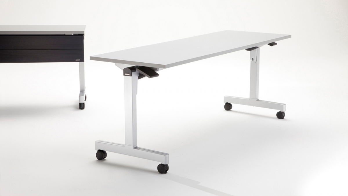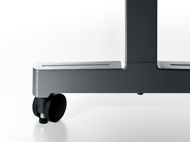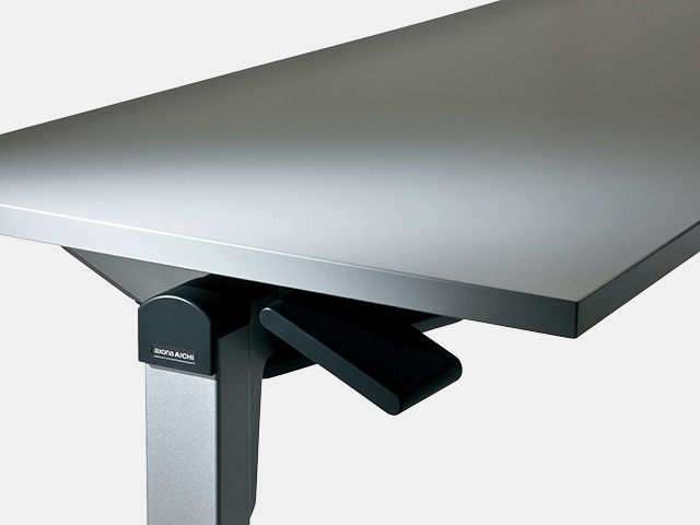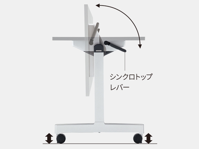 天板がフラップする機構に連動して、4点のキャスターが上下するシンクロトップシステムを採用しています。設置時は確実にテーブルを固定し、移動時はストッパーの解除し忘れによる故障を防ぐ安全で安心の構造です。キャスターロックの手間もなく、移動・設置が簡単に行えます。