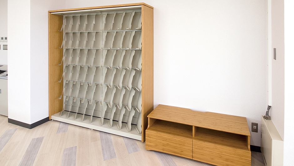 改修に伴いリニューアルされた社員の共有スペースでも、そのコンセプトを意識した空間づくりがなされており、一般の木材に比べて成木になるまでの成長が早く、環境にやさしい「竹」を素材とした家具が採用されています。