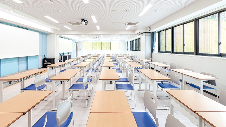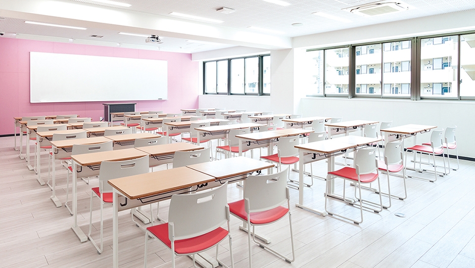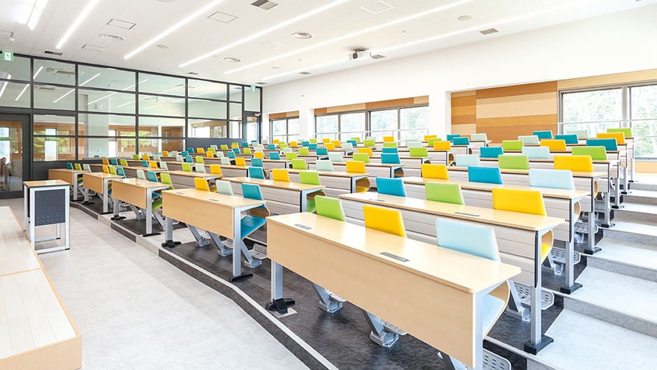 各講義室のイスは、壁面の色に合わせて座パッド色が配色されていて、カラフルで明るい空間づくりがなされています。