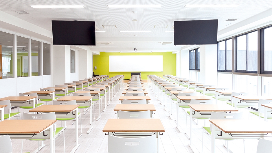 講義室〈1〉/講義デスク・イス:ラッセ・SCF-4505-4特注品 総席数120席、教卓:S-50、教壇:DAN特注品