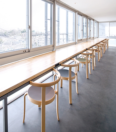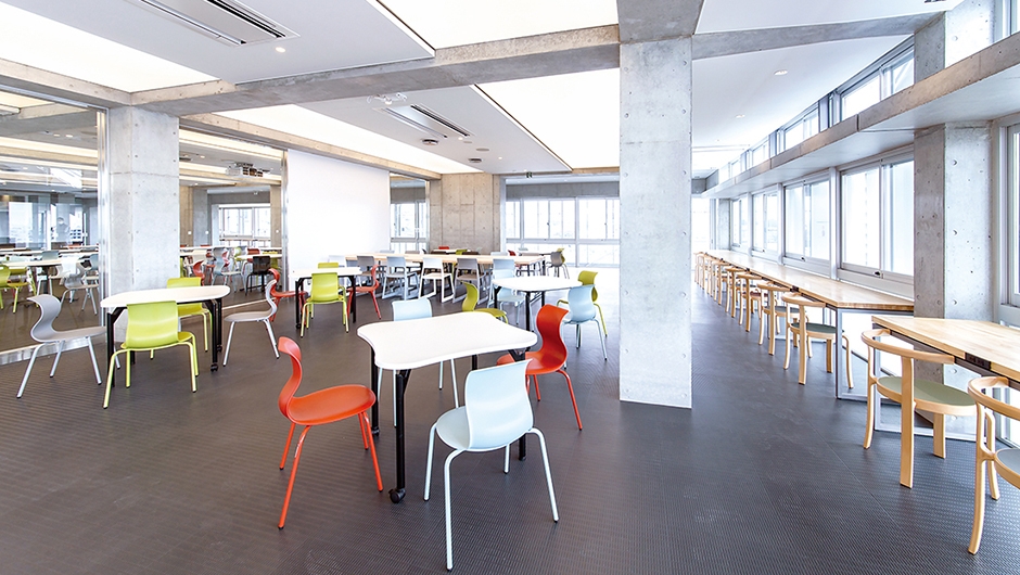 新3号館には、アクティブラーニングに対応した教室が増設されたほか、学生ラウンジやカフェなど学生にとっての憩いの場も設置されており、ダークグレーのラバータイルに6色の背・座カラーのイスが際立つ空間となっています。