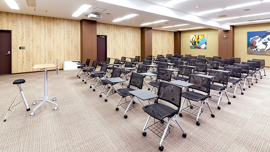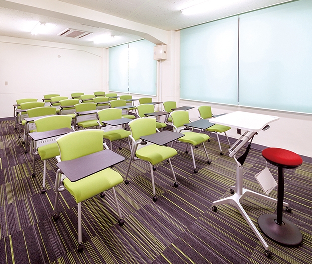 アクティブラーニング教室ではタブレット付のイスが採用され、学生が自由で活発に発言できるように配慮されています。またタブレットを収納することで、テーブルと組み合せて使用することもでき、様々なバリエーション展開ができます。