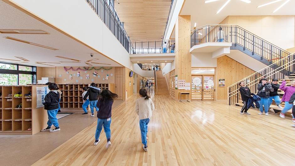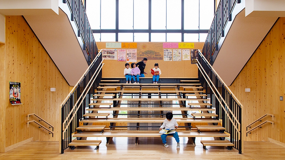 笠間小学校の新しい図書館は、学校の中心となっている吹き抜け空間「だんだんホール」と連動して活用するように考えられており、子どもと本がふれ合う機会が多くなることが期待されています。