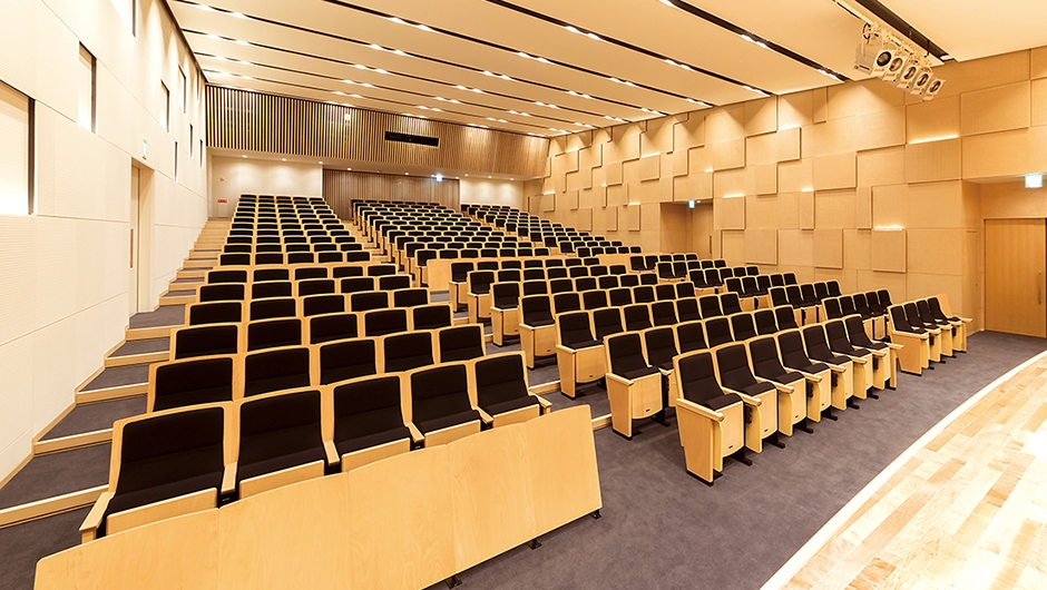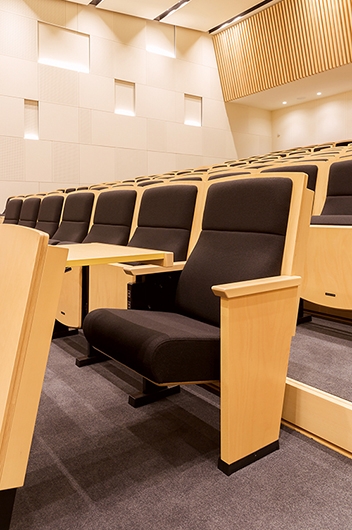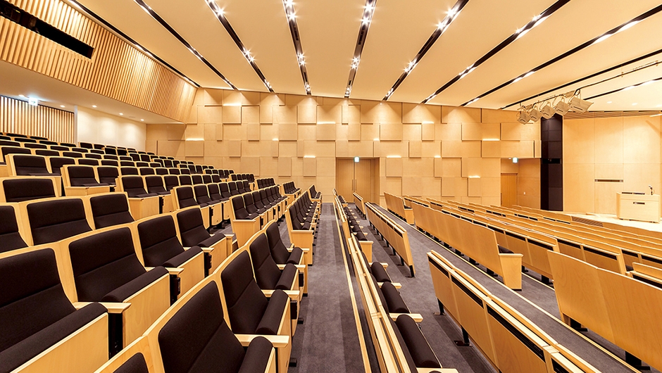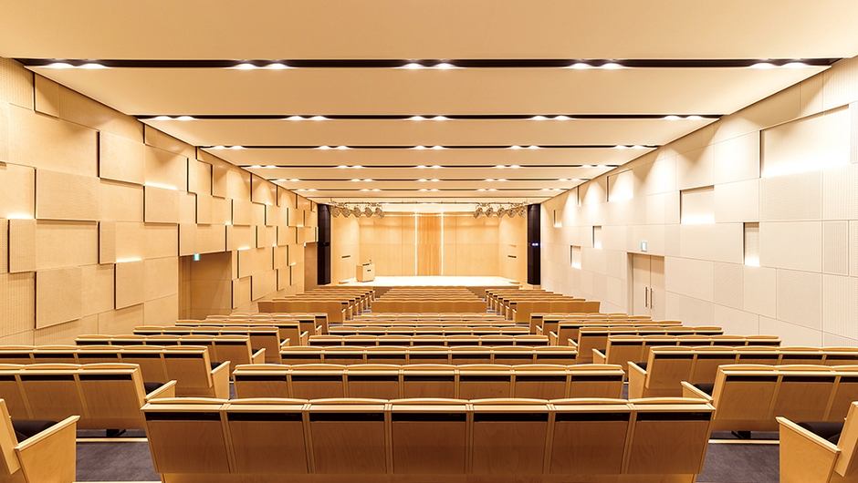 東北医科薬科大学は2016年に医学部を新設。それに伴い新たに福室キャンパスが整備され、医学部の活動拠点となる医学部教育研究棟が建設されました。地上7階建ての教育研究棟は、1階から3階が教育・学習エリア、4階から7階が研究・実験エリアとして構成されています。教育・学習エリアには、学生、教職員をはじめ、院内外医療関係者や地域の方を対象とした講演会・研修会など、交流の場として活用される「プラタナスホール」が設置されました。
