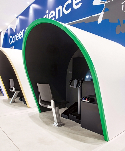 2階オリエンテーションシアターは3D仕様のスクリーンが設けられ、航空機づくりの歴史を来館者に紹介します。また、職業体験コーナーではフライトシュミレータが5基設置され、パイロットの仕事を疑似体験することができます。