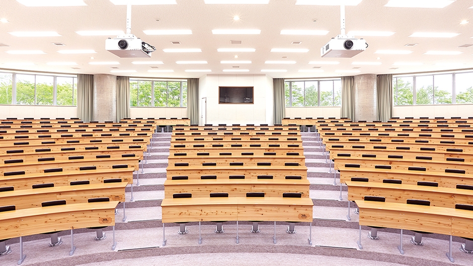 釧路市は市内の4分の3が森林という全国有数の森林都市で、木材産業の発展を目指し、森林資源の有効活用、地産地消を推進しています。改修された講義デスク・イスに釧路建具家具生産協同組合による地元産のカラマツ材が使用されており、地域に根ざした大学の象徴的な場所となっています。