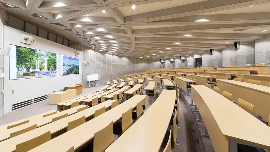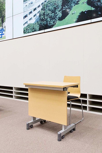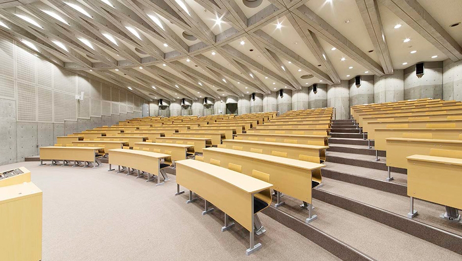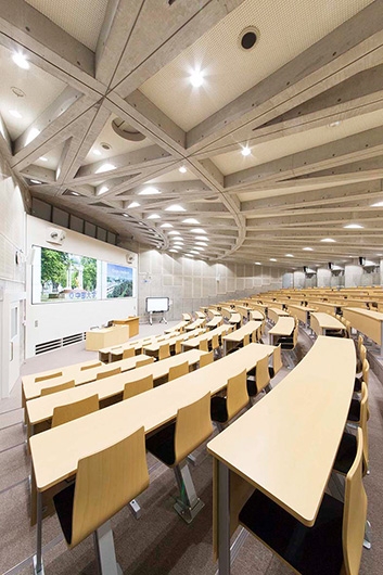 改修前のレイアウトは、円弧の中心から放射状に通路が配置されていましたが、今回すべての通路を平行に配置し、5人連を基本とした短い連数とすることで、中央部の座席にもアクセスしやすくなりました。奇数の5人連は、試験利用などの際に1席おきに着席しても効率よく席数を確保することができます。また、階段状の教室のため、各デスクの幕板を床付近までしっかり確保して、受講者の足元を隠す配慮をしています。