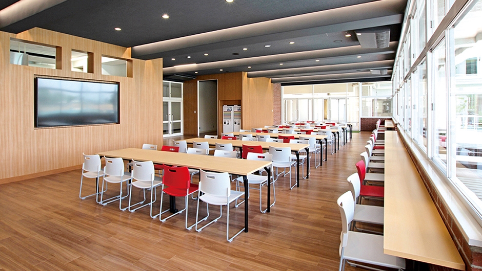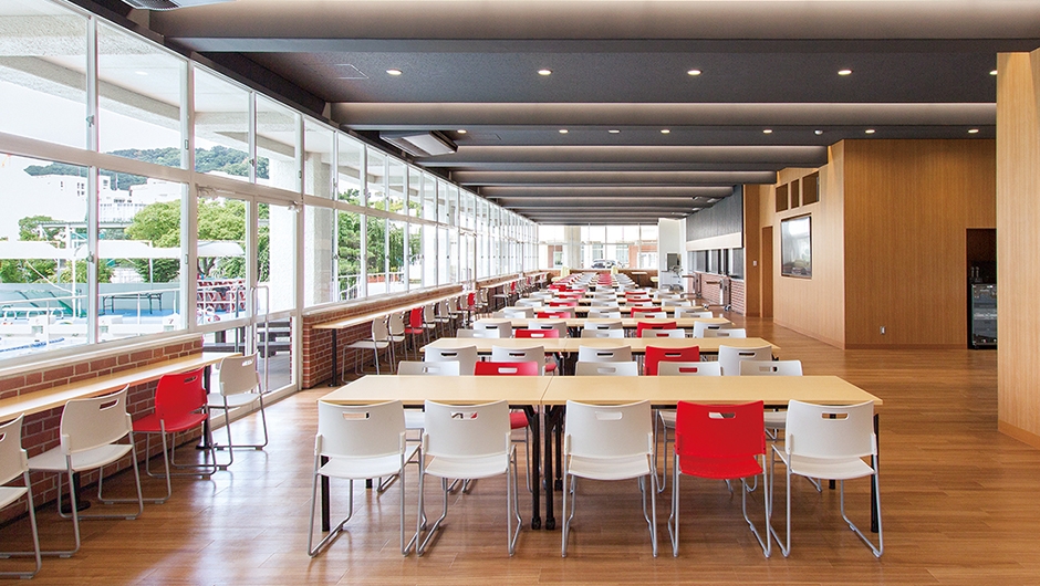 リニューアルされた食堂では、新たにプールを眺めながら座ることができるカウンター席、グループで利用できるソファ席が設けられ、生徒の利用形態に合わせた使い方ができるようになりました。また、AV設備も備えられており、保護者会等、多様な利用目的に対応できる場となっています。
