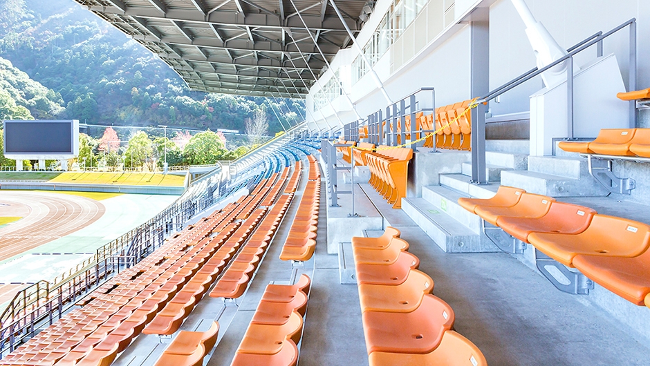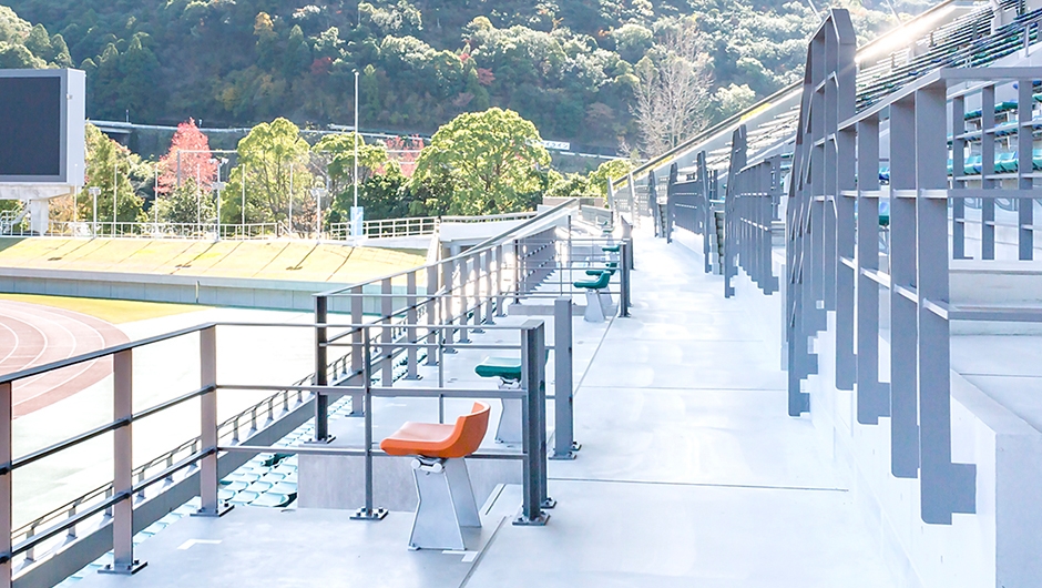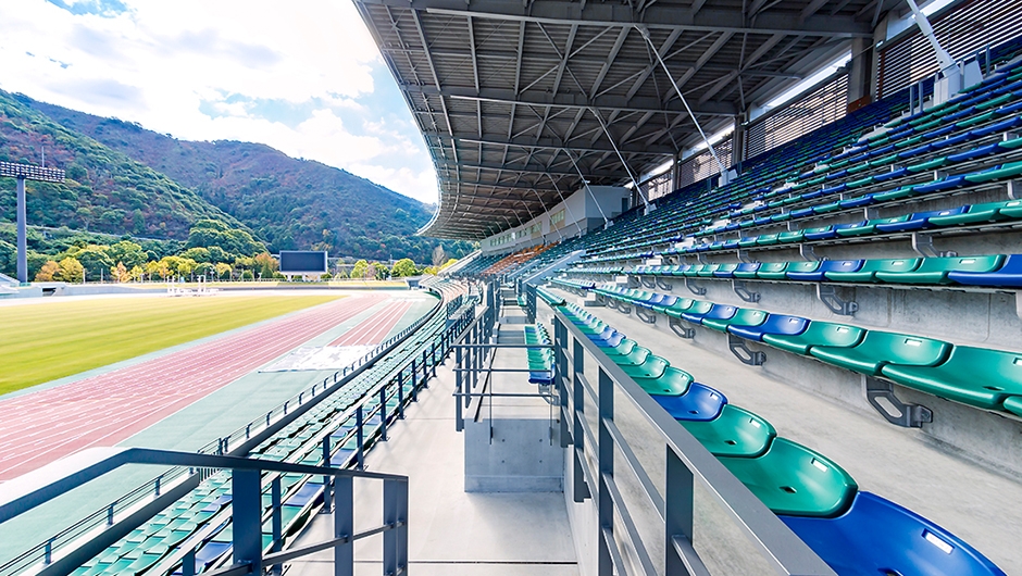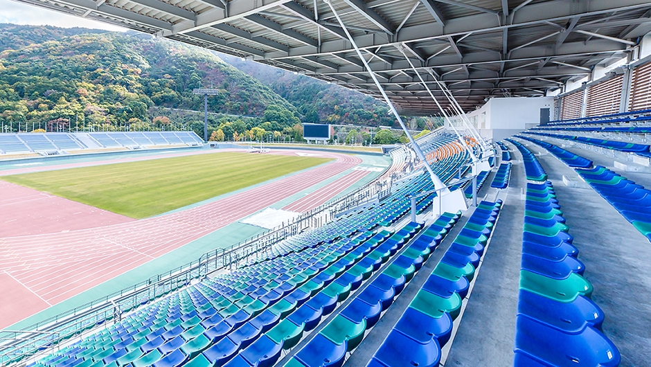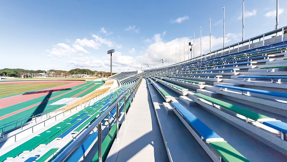 2018年のインターハイ、2021年の国体開催に向け、三重交通G スポーツの杜 伊勢 陸上競技場がリニューアルされました。メインスタンドは国体の開催基準に合わせるため全面改築がなされ、バックスタンドの改修も行われました。メインスタンドは「伊勢」に呼応した外観として、「組柱」や「木組み」といった伝統技術をイメージさせる架構デザインがなされています。観覧席は約6,000席から約7,000席に増やし、客席の色は伊勢の海と山を表現した、ブルー、グリーン、オレンジが効果的に配色されています。