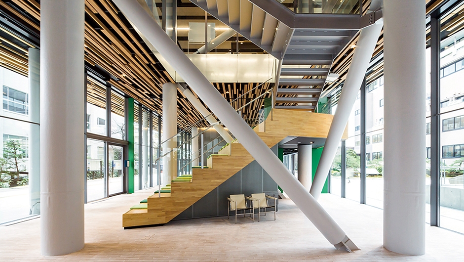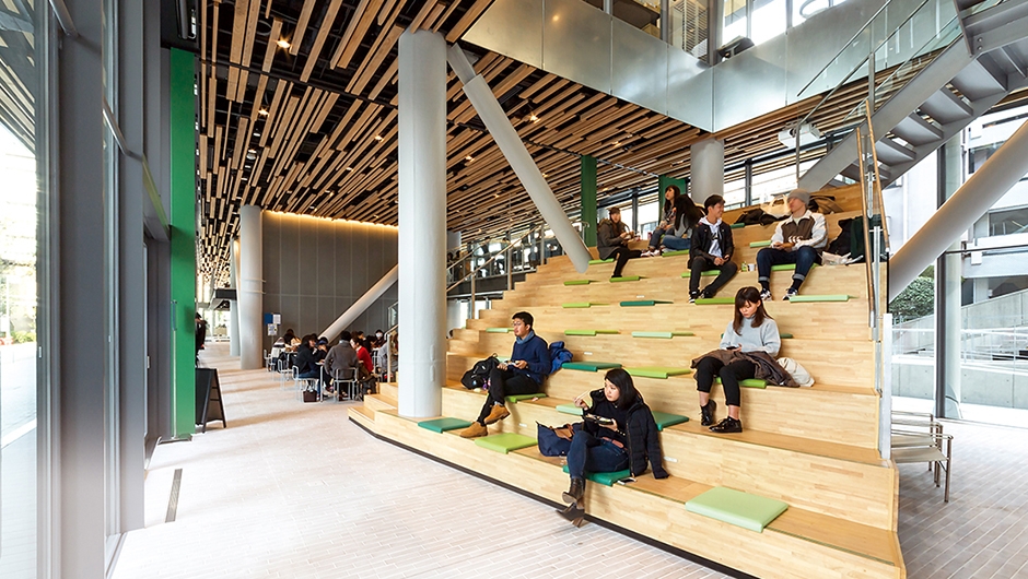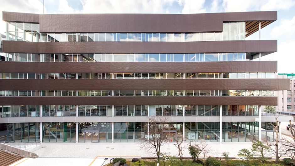 学園創立70周年の記念事業で建設された新4号館は、「透明なコアとピン柱」の組み合わせで地上6階までの層を支える構造を特徴としています。学習活動をはじめ、多彩な交流とコミュニケーションが生まれる拠点であり、キャンパスのアクティビティとインフラの中核として機能しています。また、学校建築・設計の第一人者として有名なシーラカンスアンドアソシエイツのプロジェクトとしても注目されています。
