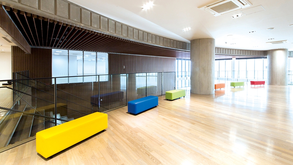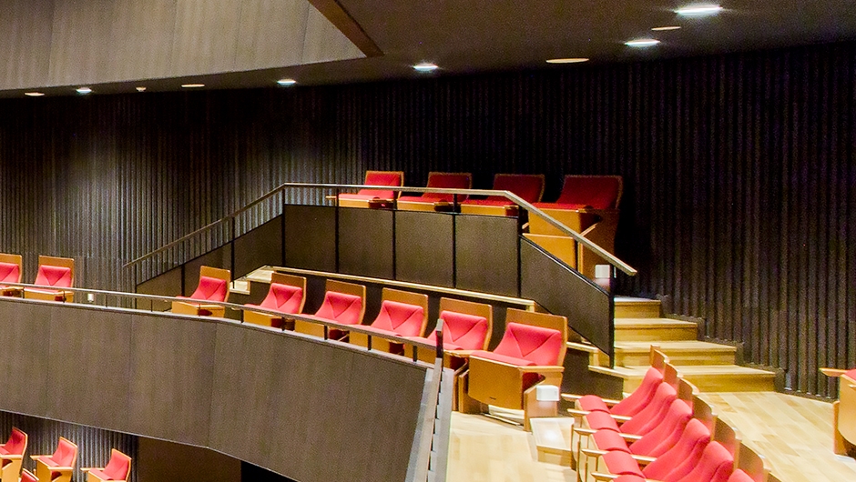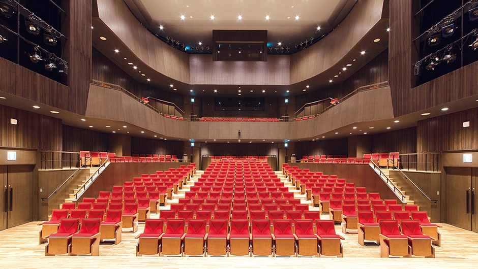 馬蹄型の多目的ホールは、2階の一部が見えづらくなるバルコニー席の視界を確保するため、床レベルを高くし、さらにそこへ配置する座席自体もハイチェアとすることで、どの座席からもステージ上がよく見えるよう配慮された設計となっています。