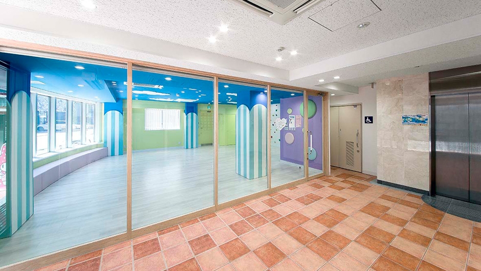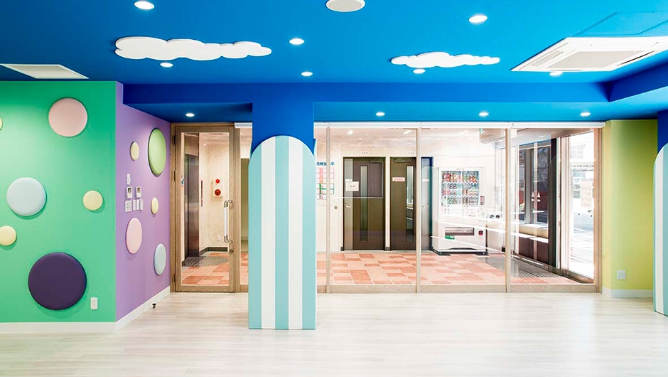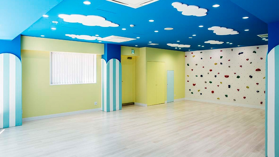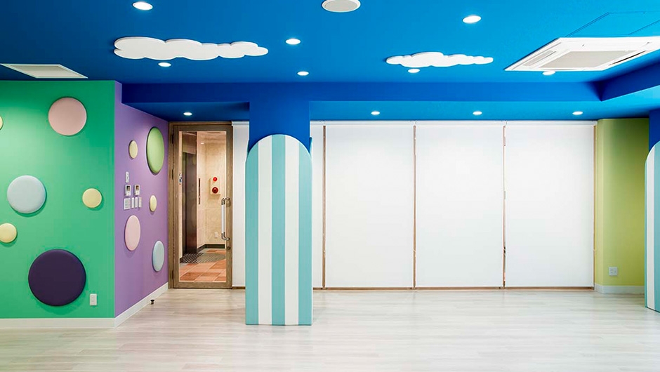ボーダー柄のクッション材を貼付けた柱型や、天井面の雲など、子どもたちを楽しませる演出がなされています。