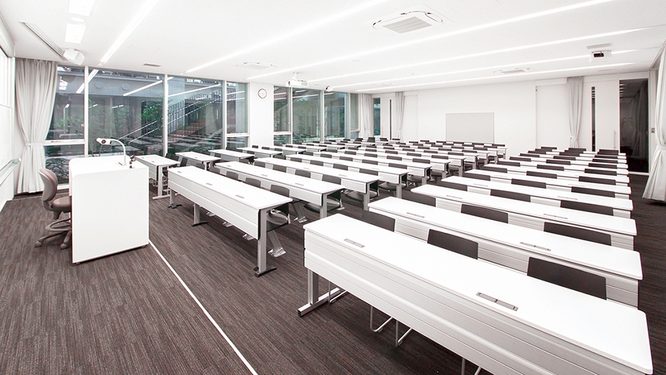 Q102教室/講義デスク・イス:SCF-PF-5105特注品、移動イス:SCM-5105-C、移動デスク:SCM-5505-T特注品 固定席115席・移動席6席 総席数121席