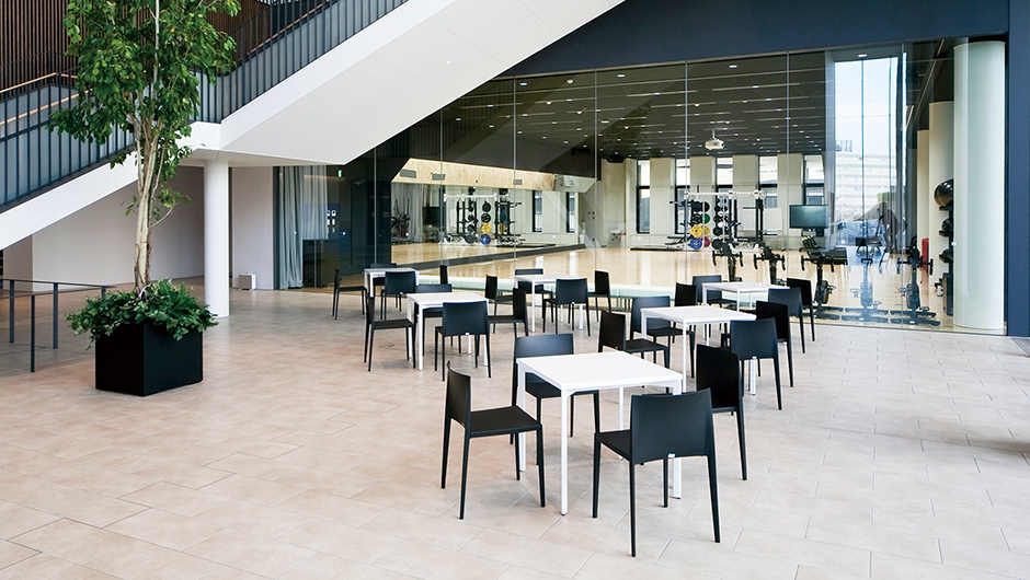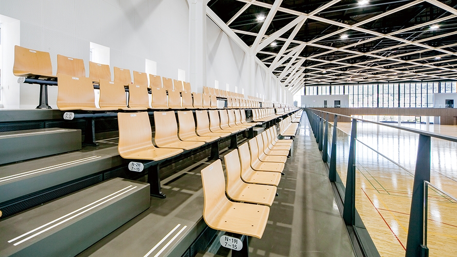 バスケットボールコート4面が設置可能な西日本最大級のメインアリーナには、3階の観客席と合わせ5000人が収容でき、参加者全員が一堂に会して入学式や学位授与式などを開催することができます。その他、スポーツ多目的室、スポーツ健康科学に関する実験・実習室や研究室、トレーニングルームなどが設置されており、学生・教職員・地域の方に開かれた交流の場となることをめざしています