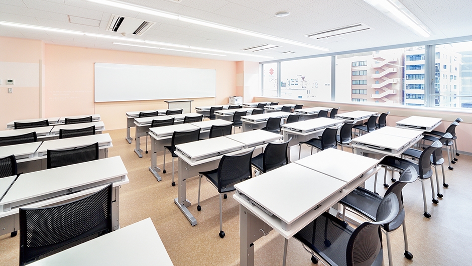 最先端の教育環境が整備されている校舎では、各フロアごとで壁紙の色を変えているほか、デスクについてはホワイトを基調に統一されており、カラフルで明るい空間づくりがなされています。