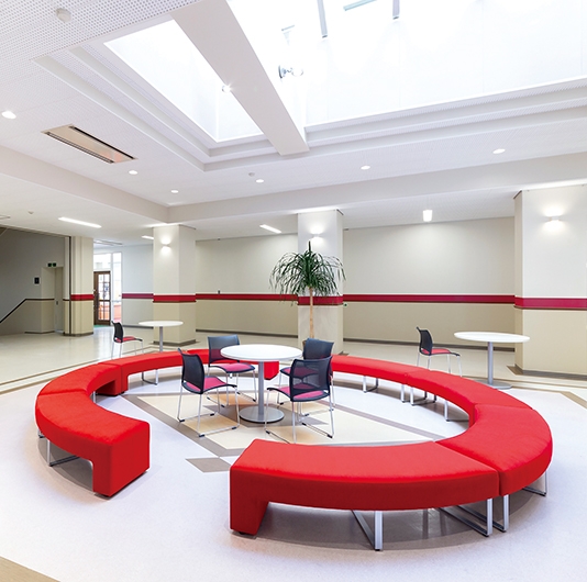 ラーニングコモンズ/イス:ルッシュ、丸テーブル:DT-P17特注品、ベンチ:ステップ特注品