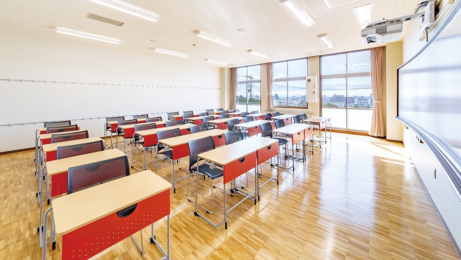 すべての普通教室では、電子黒板付きプロジェクターが配備されたほか、アクティブラーニングに対応するため、従来より広い天板でキャスター付のデスク、軽量なイスが採用されており、グループワークをはじめとした、様々な授業形態に対応できるようになっています。
