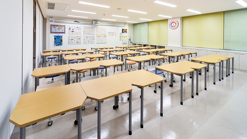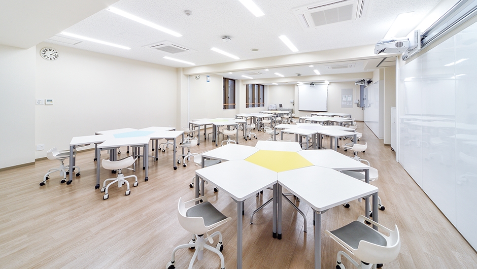 帝塚山学院小学校では視聴覚室を改修し、新たに発信力や表現力の育成を目的としたICT教育の中心となる多目的教室群の「C4スクエア」が誕生。教室内には、プロジェクターや壁面ホワイトボードが設置され、児童によるプレゼンテーションや情報の発信の場として用いられるほか、グループワークに適したホームベース型のデスクが設置されており、恊働学習を通して、コミュニケーションを育む場として期待されています。また、英語学習に特化した「Buddy-E Room」も誕生し、コミュニケーションを深く楽しむ場として運用されています。