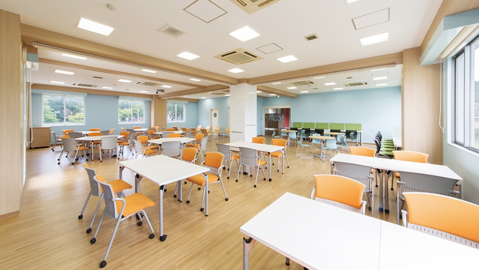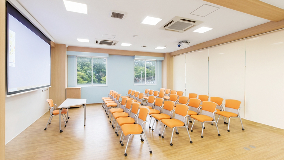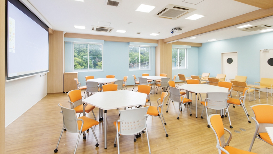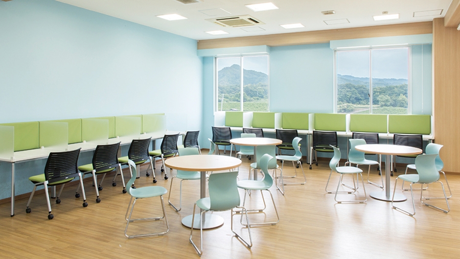 自主学習やミーティング、セミナーなど様々な使い方ができるよう、移動性の優れた家具や空間を仕切るロールスクリーンが設置されました。空間全体はパステルカラーでまとめられ、多くの学生が集う、明るく賑やかな雰囲気となっています。