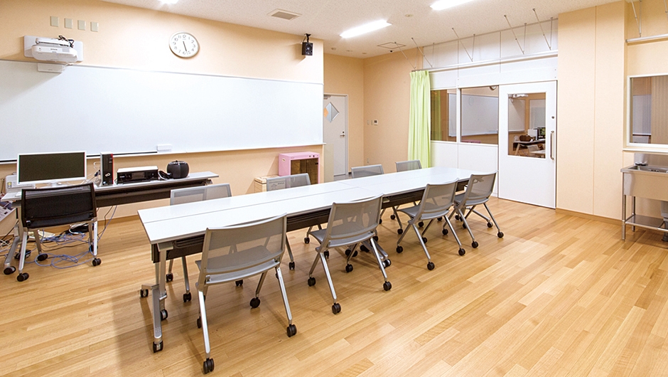 共立女子大学家政学部児童学科では、学科付設の発達相談・支援センターにおいて、子育て広場「はるにれ」を新たに開設しました。0歳から小学校就業前の子どもを対象とした保育・子育て支援施設で、広場のシンボルに「はるにれ」の木をイメージした柱が設けられています。保育・子育て支援実践演習などの授業では、隣のレクチャールームからマジックミラー越しに観察を行なったり、実際の親子との関わりを通して学ぶことができます。その他、学内の教職員等の子どもを預かる一時保育ルームも併設しています。